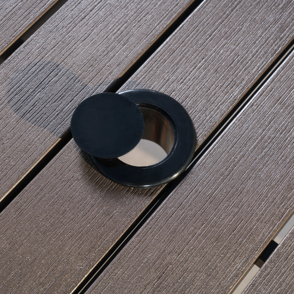 - Table features an umbrella hole for posts up to 2-inches in diameter, and includes a rubber cap to cover when not in use