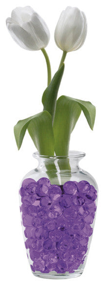 Bring a pop of brilliant purple color to your home! These decorative water storing gel beads add personality to any style decor. Just add water to create dazzling centerpieces, vases, floral arrangements and other home decor. Replaces marble effect in vases. Coordinate different colors for weddings, birthdays, parties, and more. One eight-ounce jar makes six gallons of bead product. Non-toxic.