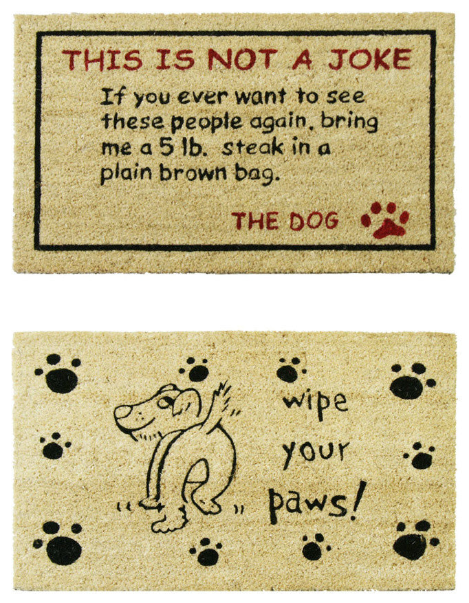 Make sure you add some fun doggie decor to your entryway or patio with this doggy door mat kit! Included are 2 doggie door mats, both sized at 18" x 30". Both of these walkoff mats are designed for canine lovers and are made to scrape all of that dirt and debris off your paws. Included is the Bring a 5lbs Steak! pet door mat. If you want to make visitors stop and laugh in your doorway, this mat is right up your ally! Visitors are reminded to wipe their dirty feet before they track in mud and debris with the Wipe Your Paws Dog Doormat, also included in this kit. Both pet accessories are made of all-natural coir, a heavy-duty fiber extracted from the outer husks of coconuts. Coco doormats are not only great for their eco-conscious nature, but for their dirt scraping abilities. When coco coir is bundled for a coconut fiber doormat, it creates a thick and flexible bristle capable of efficiently sweeping dirt and debris off your feet and the paws of your furry family member, great for your dog after a walk in the park! Not only tough on dirt, these doormats are strong and durable. Part of their durability is due to the fact that these doggie door mats are moisture resistant, capable of handling rainy wet weather and wet dogs. Moisture resistance also means these mats are less likely to grow mold or mildew. For these coco door mats, outdoor weather is not a problem. Thanks to UV and ozone resistance, this outdoor decor will even be protected from the sun. Each doggy door mat is made to sit outside your doorstep for visits to come. Add to your doggie aesthetic with these doggie yard signs today!
