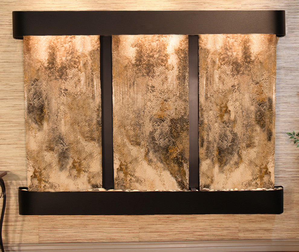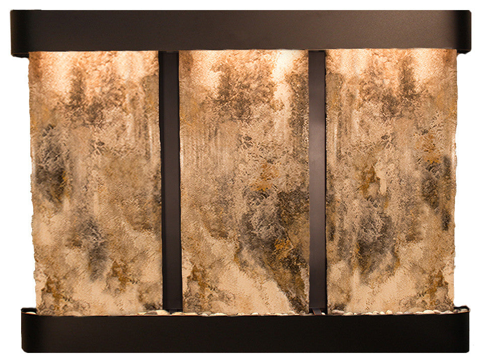 The Deep Creek Falls water fountain creates a peaceful atmosphere while adding beauty to your wall. Each of the three panels are unique and are covered in flowing water. This impressive water feature is easy to maintain and clean. When using distilled water, it only needs to be cleaned every 2-3 months. It is self-contained, which means you just need to add water to the tray every couple of days. Only one cord needs to plug into a 110V outlet, and comes with a 90 degree plug, allowing you to plug it in behind the water feature to conceal your cords.91" L x 69" H x 6" D, easy to hang, complete with colored instructions and hardware for hanging on a sheetrock wall. Hanging Weight 720 lbs.This unit includes: 6 halogen lights Polished river rocks 3 Electric pumps3-way pull chain that allows you to run just lights, just water, or lights and water. Welded plastic liner insures against leaking and unique water distribution unit system will not clog. 110V, 100W; one cord operates entire unit; 90 degree plug can be concealed behind water feature. Durable powder coat finish; Manufactured and assembled in the USA with a 1 year limited warranty. • All travertine are natural and may differ in color and texture from the picture shown due to their natural uniqueness.