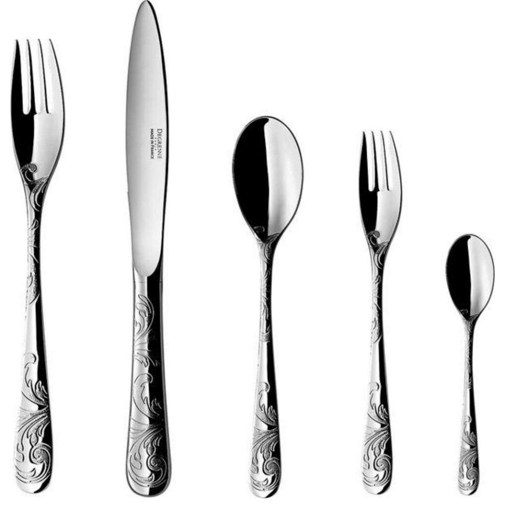 Discover everlasting lace"¦ The AQUATIC Couture collection is made in our french manufacture in Vire Normandie and is the perfect reflection of the House"™s know-how: the lace arabesques inspired by the Haute Couture art are finely engraved on stainless steel. The decor is stamped a unique expertise of Degrenne"™s craftsmen. Experience and patience are the key words when it comes to taming stainless steel: each matrix is manually engraved and then hits the metal to reveal pure lines evoking the meticulous work of lace makers. The unique lace pattern adorns the flatware collection on handles and high parts to create a refined look. Theses volutes will give a special style to tables bringing absolute elegance to enhance exceptional dishes.Specifications:Stainless Steel w/ Engraving5 piece setDishwasher safeMade in France