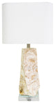 Shells with a twist! Natural Vietnamese capiz shells, inlaid in an overlapping pattern on a simple column lamp, with a "twist" bottom. On top of two stacks of clear optic crystal. Topped with a square rounded corner shade in white linen. Artisan-crafted in Vietnam.Additional Details: Dupioni Silk, Paper, Metal, Etc.:12/12 x 12/12 x 12"H Square Rd. Corner Hardback in White LinenUL, ADA, CUL, CSA:UL + CULLighting Details:Voltage:120Pack:1Wattage:100wType:N/A