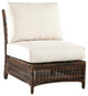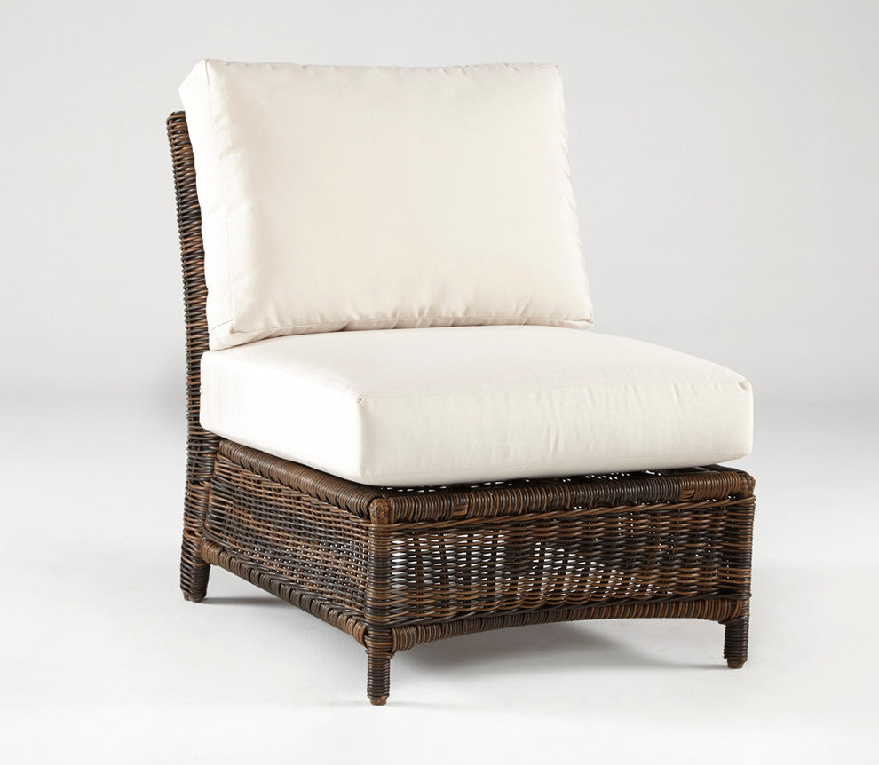 The Del Ray is outdoor entertaining and lounging at its finest. Rounded all-weather wicker in a warm chestnut finish is woven over rustproof aluminum framing, made to withstand the elements and hold its beauty year after year. Available in traditional deep seating, modular sectional pieces, and multiple dining options.