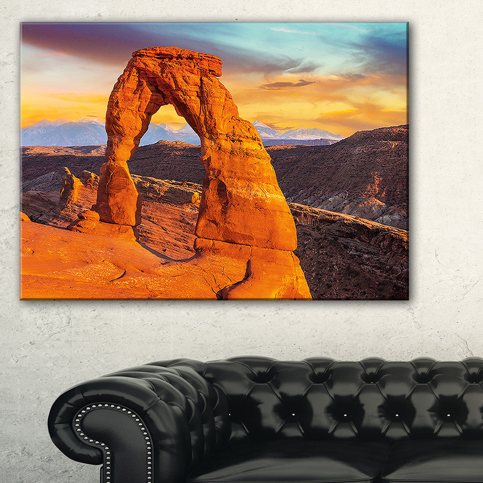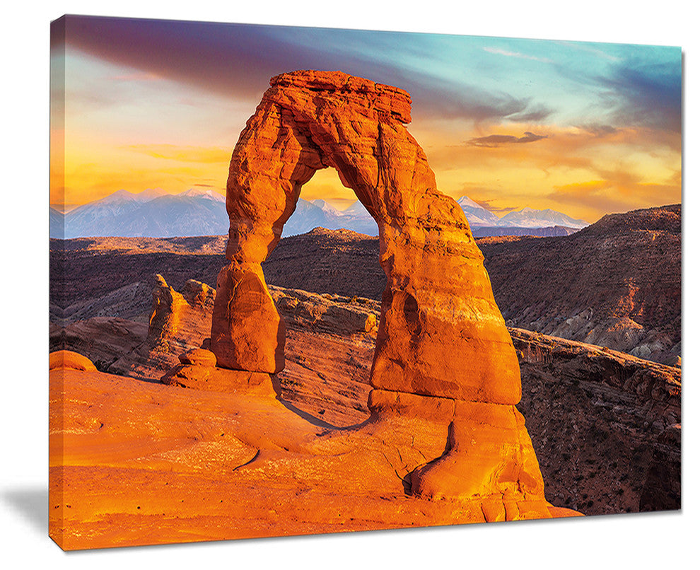 The Delicate Arch in Arches Park canvas art print is sure to make an impression on anyone who sees it. This artwork is gallery wrapped around a 1-inch solid wood frame and arrives carefully packaged and entirely ready to hang on the wall. Design Art only uses the highest resolution and pigments to ensure a crisp colorful print that is never faded or pixelated. This artwork is sure to be a conversation starter in any home or office.