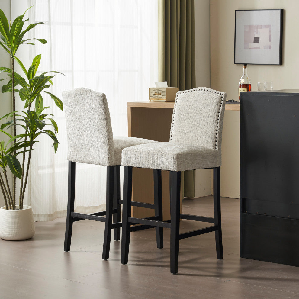 Modern Elegance: Elevate your space with the sleek design of these bar stools, crafted from premium solid rubberwood. The dark walnut-finished legs and minimalist silhouette add a touch of sophistication, making them a stylish addition to any kitchen island, bar, or dining area.• Ultimate Comfort Design: Designed for all-day comfort, the ergonomically shaped backrests provide excellent support for your spine. The soft PU leather cushions and 45" counter height make them perfect for enjoying meals, drinks, or conversations at your kitchen island or breakfast bar.• Reliable Stability & Durability: Each bar stool is built to handle up to 300 lbs, offering unbeatable reliability for everyday use. The legs are equipped with plastic pads to protect your floors from scratches, while enhancing stability for a secure and wobble-free seating experience.• Wipe-Clean Convenience: Forget the stress of spills with the PU faux leather seating. Its spill-resistant surface ensures stains are repelled instantly, allowing you to easily wipe away messes with a damp cloth. Keep your bar stools looking fresh and spotless with minimal effort.• Space-Saving & Easy Assembly: With a compact, modern profile, these stools tuck neatly under counters to save space when not in use. Assembly is simple and hassle-free, thanks to included instructions and tools. Ideal for intimate gatherings or entertaining larger crowds.• Includes: Two (2) Bar StoolsMaterial: Rubber Wood + Foam + FabricColor: Multiple OptionsAssembly RequiredDimensions: 18.50 inches wide x 21.80 inches deep x 45.00 inches highSeat Height: 30.75 inches