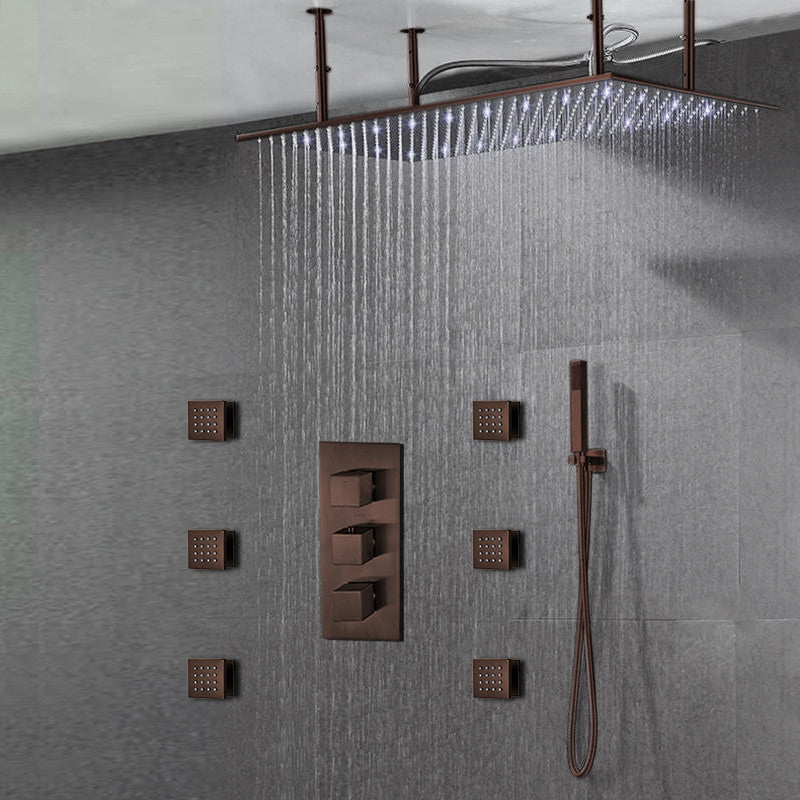 Diadema Shower Set''s adjustable shower jets can be set according to your showering position and can increase and decrease shower jest speed to give you better massage experience. Diadema Shower Set''s shower mixer has 6 body shower jets and a handheld shower hose. Diadema Shower Set SpecificationsMaterial: Solid BrassFinish: Oil Rubbed BronzeStyle: Contemporary Rain Shower headShower Arm: IncludedShowerhead Width: Available in 20" - 40"Showerhead Length: Available in 20" - 40"LED Power Source: Water FlowShowerhead Style: Contemporary Rain ShowerMount Method: 4 Ceiling mount arms includedConnection: 1/2" US standard (included)Flow Rate: Maximum 1.8 GPMAerator Included: Minimum .5 GPMComes with solid brass mixerDiadema Shower Set Features- This high tech rain shower head powers the LED lights using a built in hidden dynamo- The lights will automatically turn on when water pressure is turned on- The lights will dim and brighten when you lower and raise the pressure so you can set the perfect mood, water and light- The shower head will automatically change colors according to the temperature of the water so you always know how the water will feel on your skin just by looking at it- Never be scalded again by entering a shower that is just too hot- The threading is universal so it will fit any standard shower head by simply unscrewing the old one by hand and attaching the new one. - A shower arm is included. - The Shower head can be used with either wall or ceiling mounted arm- Modern Stylish Design Completely stainless steel finished with ORB is made to match or stand out from your other bathroom fixtures- High Quality This modern shower head is made out of stainless steel, so its made to last!Comes with solid brass 360 Degree ? adjustable Body Jets finished in Oil Rubbed Bronze. Body Jets size 5" x 5"