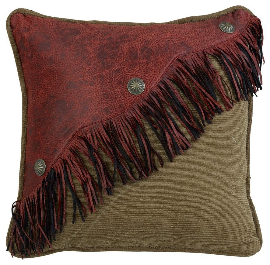 The HiEnd Accents San Angelo collection mixes paisley print with fun pops of leopard chenille, red faux leather, and teal velvet for a designer collection with western flair. This accent pillow features a neutral chenille with red faux leather fringe and brass Conchos. Insert included. Zipper closure allows for simple cleaning. Dry clean only.