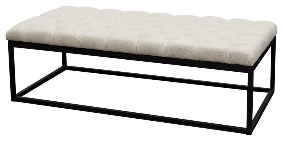 Black Powder Coat Metal Large Linen Tufted Bench In Desert Sand Linen In The Mateo Collection By Diamond Sofa The Mateo Bench Collection by Diamond Sofa offers "industrial contemporary" styling with its deep tufted Desert Sand Linen Seat on a Black Powder Coated Metal Base. With its open base design, it offers a stylishly light addition to your decor. Great for use as accent seating, foot bench, cocktail ottomans. Mateo Bench Ottoman is available in two sizes.