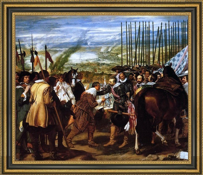 16" x 20" Diego Velazquez The Surrender of Breda (also known as The Lances) framed premium canvas print reproduced to meet museum quality standards. Our Museum quality canvas prints are produced using high-precision print technology for a more accurate reproduction printed on high quality canvas with fade-resistant, archival inks. Our progressive business model allows us to offer works of art to you at the best wholesale pricing, significantly less than art gallery prices, affordable to all. This artwork is hand stretched onto wooden stretcher bars, then mounted into our 3 3/4" wide gold finish frame with black panel by one of our expert framers. Our framed canvas print comes with hardware, ready to hang on your wall. We present a comprehensive collection of exceptional canvas art reproductions by Diego Velazquez.