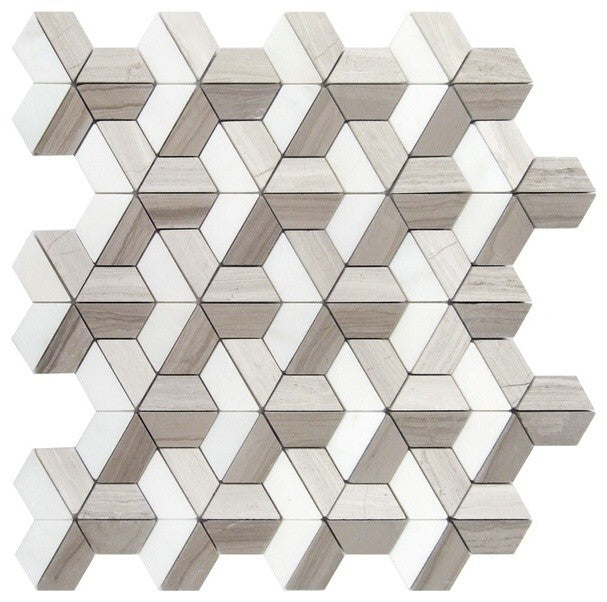 White Oak Dimensions 3D Polished marble mosaic is rich with shades of cool and warm whites in a natural linear pattern echoing natural oak. The design pattern is a blend of White Oak, Athens Gray & Carrara white on meshed back. This marble is recommended
