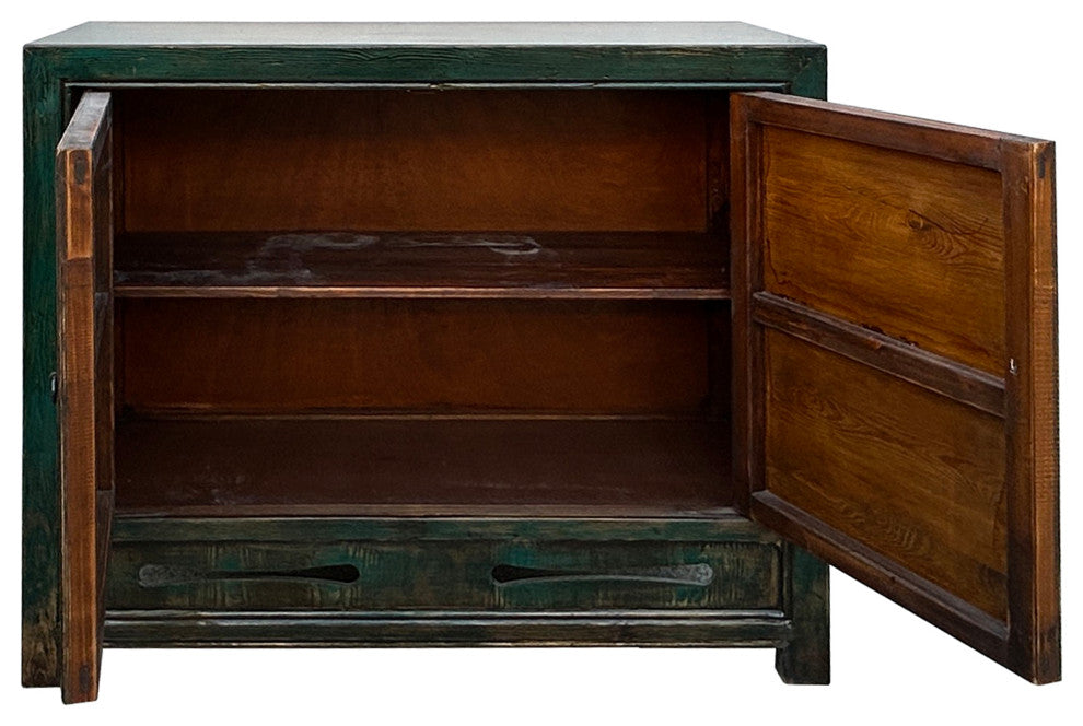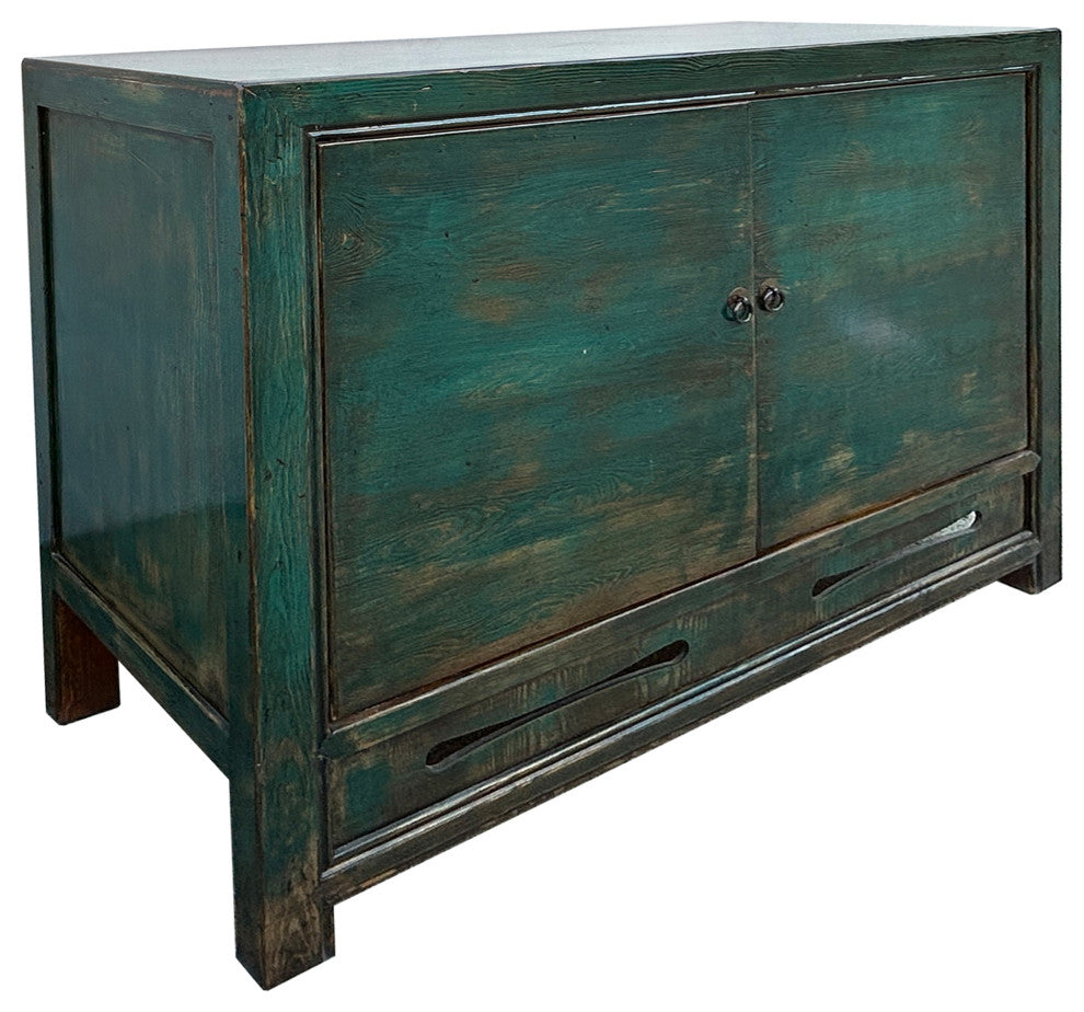 This oriental cabinet exudes rustic charm with its distressed teal blue green finish and simple, elegant design. Crafted from solid wood with hand-carved details, this cabinet features two doors , offering ample storage space for books, decorative items, or personal belongings. The weathered patina adds to its vintage appeal, making it a unique and captivating addition to any home decor. This piece seamlessly blends traditional Chinese craftsmanship with a modern aesthetic, bringing a touch of history and character to your living space.Dimensions: 43.5" x d16.5" x h35.5", inside w40" x d14"x h24"Origin: ChinaMaterial: Elm WoodCondition: hand-made, distressed marks, original chip marks . Work: Ship in one pieceUS domestic continental buyer of 48 states pays $445 shipping charge for curbside delivery. Customer from New York, Hawaii, Alaska, US Island, Florida Keywest, and Canada pays extra shipping cost. Insurance and handling charges are already included in the shipping cost. In-store pick-up is highly welcomed if you are in San Francisco Bay Area. (No charge) White-Glove (4-8 weeks transit) service can be arranged with additional cost - needs quotation based on the destination.