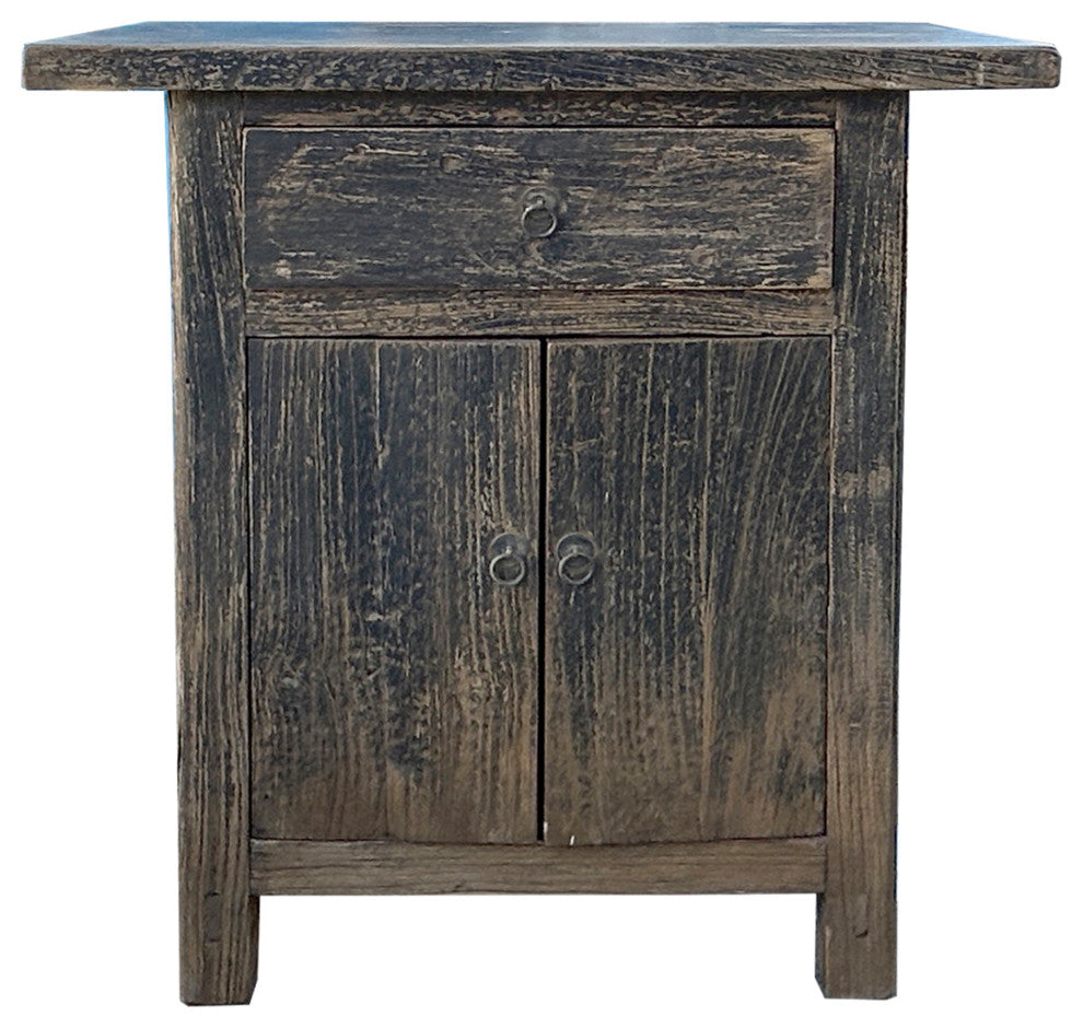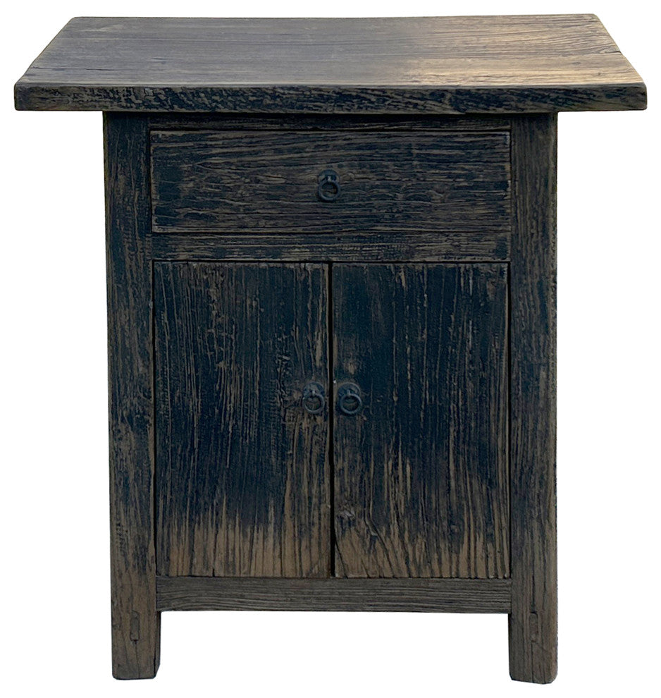 Experience the timeless charm of this Distressed Rustic Black Rough Grain Wood Side Table Nightstand Cabinet. Crafted from high-quality wood with a striking rough grain texture, this piece exudes rustic elegance. The distressed black finish adds a touch of vintage character, perfectly complementing any farmhouse, industrial, or modern decor. Featuring ample storage space with drawers and shelves, this versatile side table effortlessly functions as a nightstand, end table, or accent piece. Elevate your home with this top-rated, durable, and stylish addition. Dimensions: Top 31.5" x d18", body w23"x d16.5"x h33"Origin: ChinaMaterial: Elm WoodCondition: hand made, wood joint lines, distressed wood gap expansion repair-marks, variation in grain and color distribution. Work: ship in one pieceWe offer a flat shipping fee of $380 for customers in the contiguous United States (48 states) for convenient curbside delivery. (Additional shipping costs will apply to customers in New York, Hawaii, Alaska, US Islands, Florida Keywest, or Canada, based on their specific location). The shipping cost includes insurance and handling charges for added protection.For customers in San Francisco or the Bay Area, we provide local delivery at a cost determined by the distance. You can find the exact cost by entering your zip code during checkout. Alternatively, you can pick up your order in-store with no extra shipping fee.If you need extra care and a white-glove experience, we offer a specialized service with a 4-8 week transit time, tailored to your destination. Contact us for a detailed quote on this service.Upon receiving your shipment, please carefully inspect the exterior packaging while the delivery personnel are present. Note any visible damage on the delivery paperwork, as carriers do not typically honor concealed damage claims. Your cooperation in documenting any visible damage is greatly appreciated