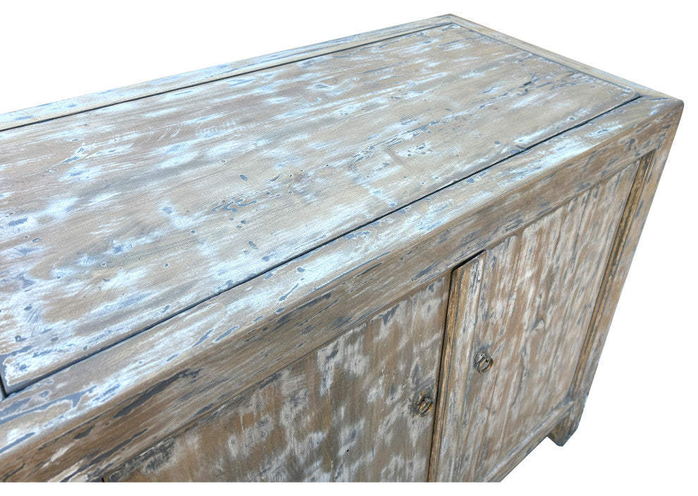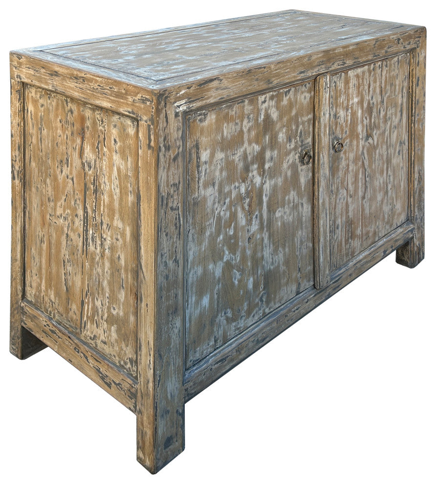 This captivating retro cabinet exudes rustic elegance with its beautifully distressed finish, showcasing a weathered patina that tells a story of time and use. The exterior, a blend of faded white and natural wood tones, features a textured surface with peeling paint and visible grain, adding to its vintage allure. The cabinet is designed with two sturdy doors, each framed by a simple yet refined border, and equipped with classic round knobs that hint at its traditional craftsmanship. Inside, the open doors reveal a spacious interior with a single shelf, crafted from warm, natural wood that contrasts beautifully with the exterior, offering practical storage space. Supported by four solid, slightly curved legs, this piece combines functionality with an artisanal aesthetic, making it a perfect addition to a cozy, eclectic home.Dimensions: w39.5" x d17.75" x h33.25", inside w37" x d15" x h25"Origin: ChinaMaterial: WoodCondition: hand-made, distressed marksWork : Ship in one pieceWe offer a flat shipping fee of $445 for customers in the contiguous United States (48 states) for convenient curbside delivery. (Additional shipping costs will apply to customers in New York, Hawaii, Alaska, US Islands, Florida Keywest, or Canada, based on their specific location). The shipping cost includes insurance and handling charges for added protection.For customers in San Francisco or the Bay Area, we provide local delivery at a cost determined by the distance. You can find the exact cost by entering your zip code during checkout. Alternatively, you can pick up your order in-store with no extra shipping fee.If you need extra care and a white-glove experience, we offer a specialized service with a 4-8 week transit time, tailored to your destination. Contact us for a detailed quote on this service.Upon receiving your shipment, please carefully inspect the exterior packaging while the delivery personnel are present. Note any visible damage on the delivery paperwork, as carriers do not typically honor concealed damage claims. Your cooperation in documenting any visible damage is greatly appreciated