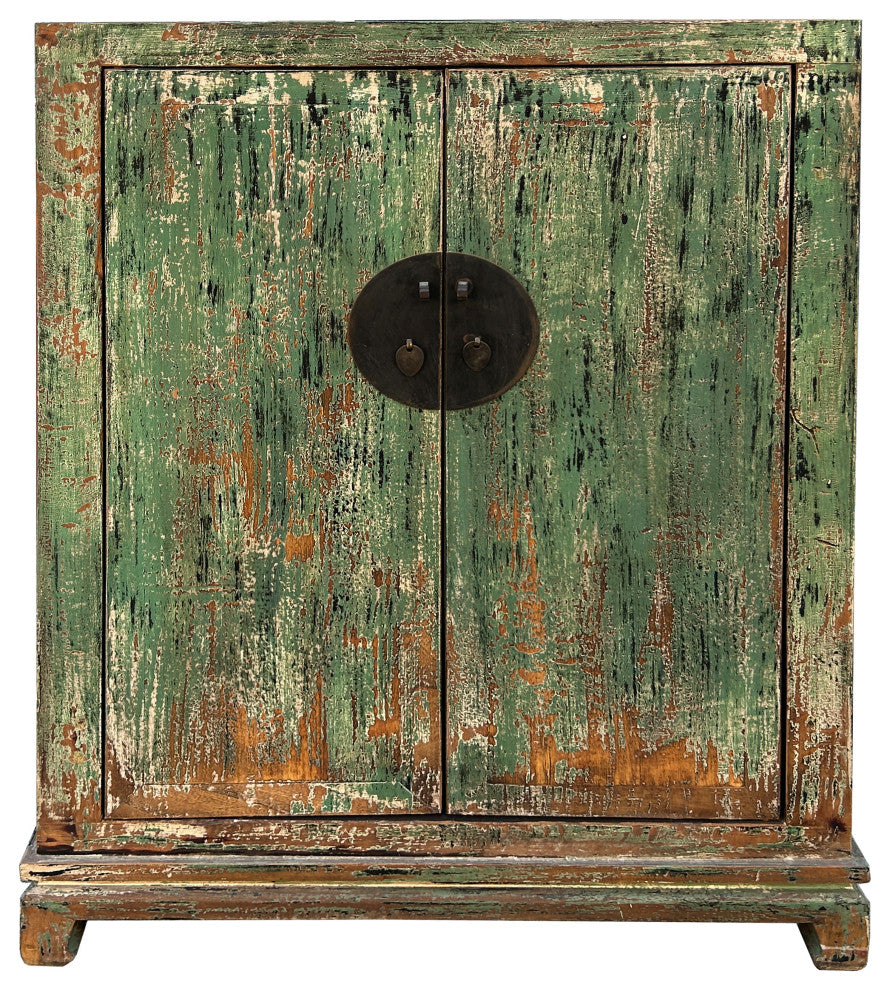 This Distressed Green Chinese-Inspired Cabinet is a testament to exquisite craftsmanship. The distressed teal green finish gives it a unique and one-of-a-kind look, while the authentic Chinese-inspired details evoke a sense of history and culture. The two doors provide ample storage space, making this cabinet both functional and stylish. This piece is sure to become a treasured part of your home decor.Dimensions: w36" x d18" x h46.5" , inside w32"x d14" x h38"Origin: ChinaMaterial: Elm WoodCondition: hand made, minor color off, vintage style finish, distressed marksWork: no assembly required, ship in one pieceUSA domestic continental buyers of 48 states pay $445 shipping (buyers of Hawaii, Alaska, US Islands, Florida Keywest, and Canada pays the extra shipping cost). Insurance and handling charges are already included in the shipping cost. In store pick up is highly welcomed if you are in San Francisco Bay Area. (No charge)