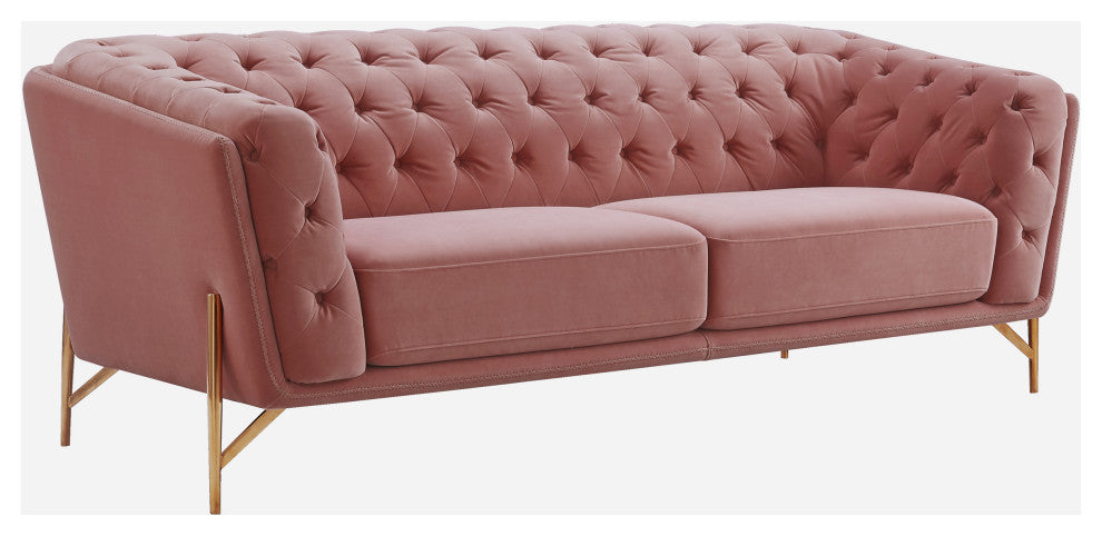 The Aiken Sofa is lovely contemporary sofa. The glam sofa comes in a salmon pink velvet and and the back is diamond tufted. The gold hairpin legs add another touch of luxury. The double layered back and arms have a lovely cream colored exposed stitch that adds a bit of rockstar to this delicate sofa.