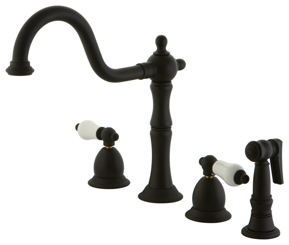 True to its name, the Heritage collection features aesthetic colonial elegance. The early American theme brings a timeless traditional design with graceful, yet attractive round curves and Victorian style spouts. The double handle kitchen faucet includes a 8"-16" widespread setup with a 360-degree turn swivel spout. The handles rotate in a 1/4-turn motion with a 2.2 GPM (8.3 LPM) 60 PSI max rate. Fabricated in solid brass for durability and reliance, we also provide an assortment of different finishes for stain, scratch and chipping resistance. Brass sprayer included.. Manufacturer: Kingston Brass. Model: KS1755PLBS. UPC: 663370117848. Product Name: Double Handle Kitchen Faucet with Brass Side Sprayer. Collection / Series: Heritage. Finish: Oil Rubbed Bronze. Theme: Classic. Material: Brass. Type: Faucet. Features: Brass Sprayer Included1/4 Turn Ceramic Disk CartridgePorcelain Lever Handle9 1/2" Spout Projection with a 7-7/8" spout clearance4 Holes Installation