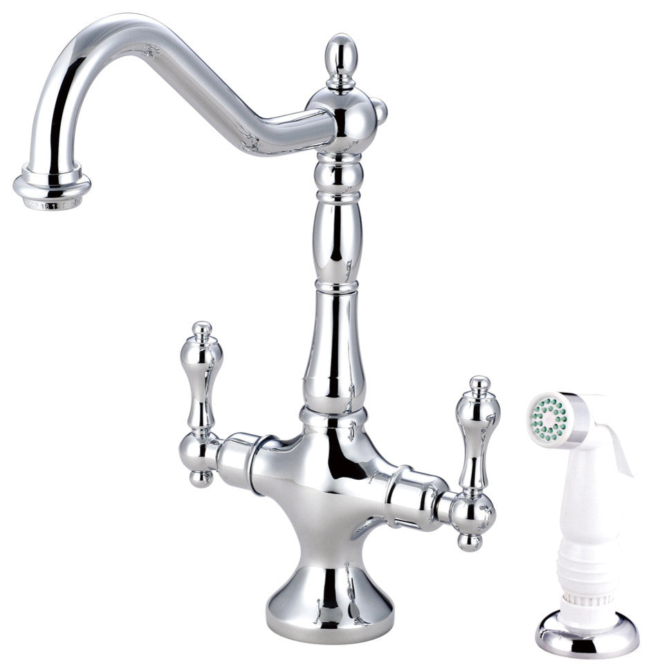 True to its name, the Heritage collection features aesthetic colonial elegance. The early American theme brings a timeless traditional design with the graceful curves and Victorian spouts. With solid brass as the material for our products, we also provide an assortment of different finishes for stain, scratch and chipping resistancebuilt to last and made to impress. White non-metallic sprayer included.. Manufacturer: Kingston Brass. Model: KS1771AL. UPC: 663370054693. Product Name: Double Handle Kitchen Faucet with White Non-Metallic Side Sprayer. Collection / Series: Heritage. Finish: Polished Chrome. Theme: Classic. Material: Brass. Type: Faucet. Features: White Sprayer1/4 Turn Hardisc CartridgeMetal Lever Handle8" Spout Projection with a 10" spout clearanceSingle Hole Installation