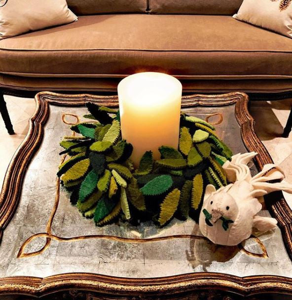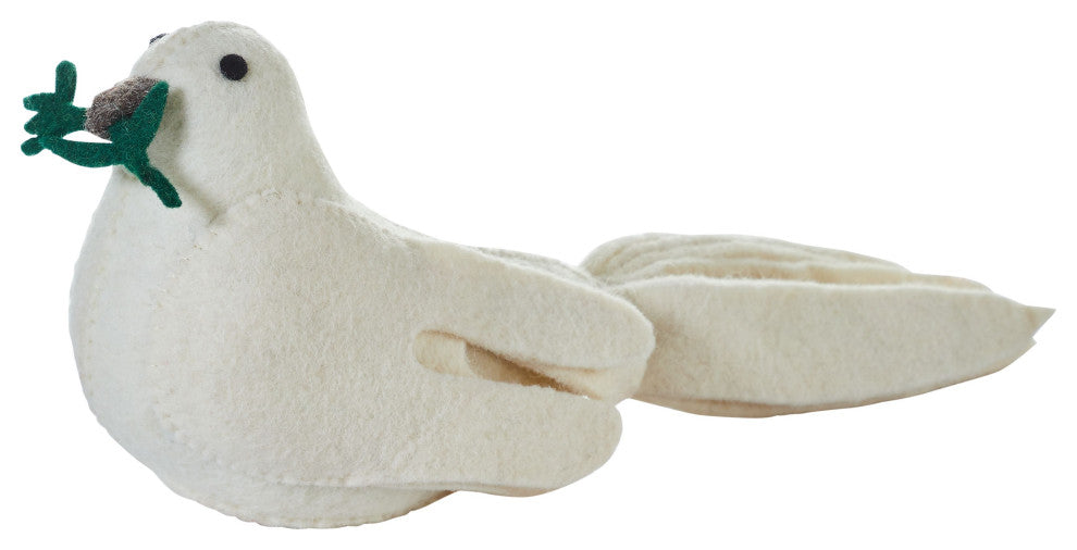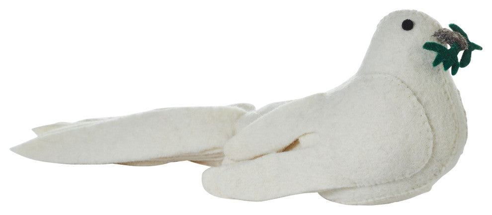 Place this wonderful dove on top of your tree. Hand felted and hand appliqued of 100% wool. 14"x6".Placing The Topper On The Tree: There is a pocket in the bottom of the tree topper. Simply insert the top branch/branches of the tree into the interior pocket. If the branches are thin- a bit of aluminum foil wrapped around the branch will create a tighter fit.Arcadia Home felt designs are hand-felted, hand appliqued, and lovingly created from 100% sustainable wool by artisans working in India. The facility where these pieces are produced is an award-winning model of sustainability, which runs on solar electricity, collects rainwater, and recycles water on-site. By collaborating with this artisan group, Arcadia Home is helping to preserve the tradition of felt making in the area, promote eco-friendly business, and provide fair and safe employment for hundreds of artisan felt-makers, sheepherders, and seamstresses. By purchasing this design, you are joining our efforts to support artisans worldwide. As handmade pieces, each Arcadia Home design is as unique as the artisan who created it.
