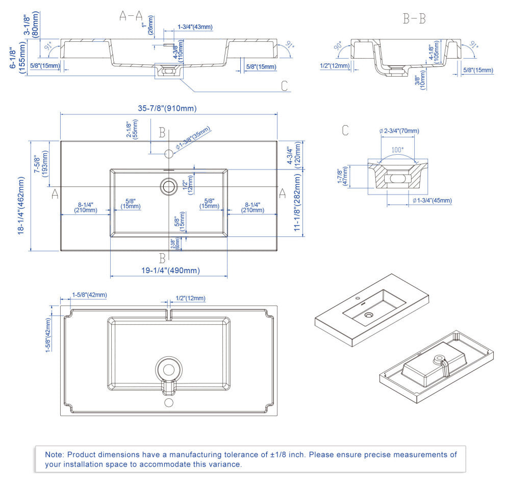 Resin topmount bathroom vanity basin with single or double sink and one faucet hole per sink. 18" front-to-back depth fits on top of a vanity cabinet of the appropriate size. Available in white, black and grey in widths of 18", 24", 30", 36" and 48"