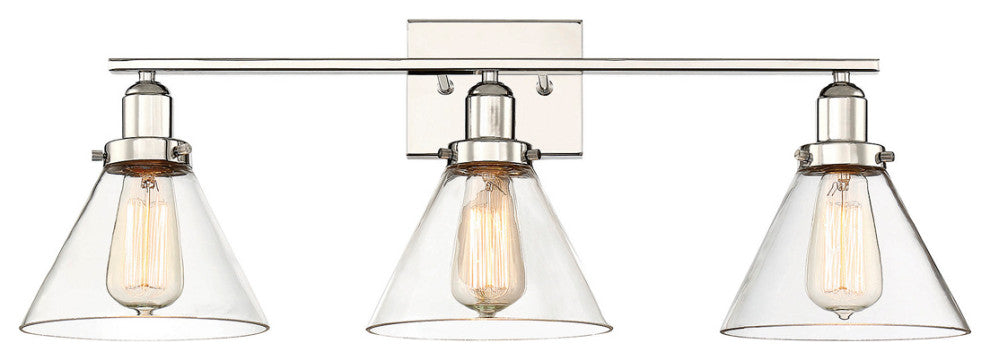 This Savoy House Drake 3-light bath bar has an alluringly simple style with a few choice hardware details and shades of clear glass. It may be mounted as either uplight or downlight. Bath bar lights are a classic choice for illuminating vanity mirrors in bathrooms big and small. Because the bulbs are exposed try using stylized bulbs (not included) such as Edison for a different look! The polished nickel finish can be paired with nickel hardware or mixed with hardware in other fixtures. Add Drake to industrial transitional or contemporary rooms for a bold look. When you choose a Savoy House lighting fixture you can be certain youve selected a piece that will withstand the test of time.