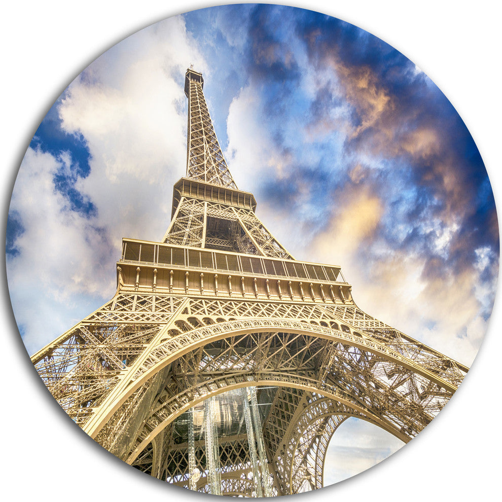 Bring Contemporary Abstraction to your home with this large Circle Metal wall art. This Dramatic Sky over Ground View of Paris Eiffel Tower Metal Artwork makes it the focal point of any room or office.