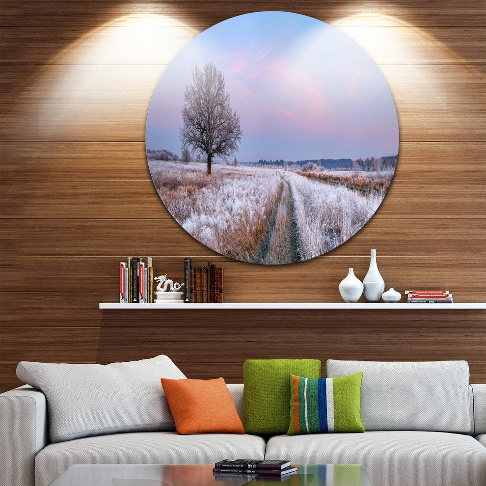 Bring Contemporary Abstraction to your home with this large Circle Metal wall art. This Dry Oak Tree in Winter Panorama Metal Artwork makes it the focal point of any room or office.