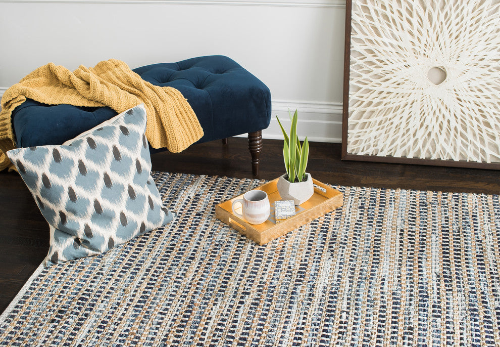 Structure, softness and classic American style meet in the all-natural Durango Area Rug. Soft denim comes together with golden jute and white cotton in this tight-woven hefty piece that hearkens back to cowboy cool. Our denim is upcycled from old blue jeans to bring that soft, worn-in feel into your favorite rooms. Here dark- and light-wash denim rag yarn is spun with golden jute, creating all the irregularities of a well-loved heirloom. Place it in a bedroom, kids'' room, living room or family room for an effortlessly chic, natural look that''s also gentle under bare feet. Like your favorite pair of jeans, this rug will also wear better as it ages.