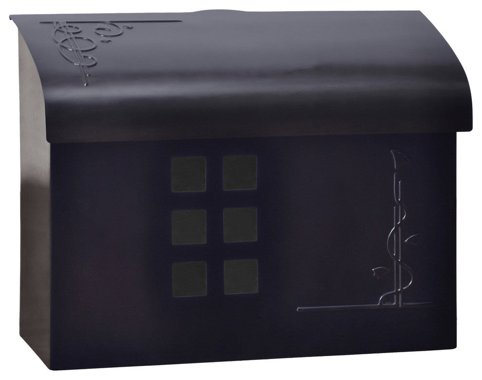The E7 mailbox is designed in the tradition of the Arts & Crafts Movement. Accentuated ornaments are in relief on its curved lid and front panel. The horizontal configuration allows for a wider opening for easier retrieval of mail. The clear acrylic covered square windows allow spotting of contents from a distance. The mailbox is crafted in 18-gauge non-rusting brass material and plated in six metal colors