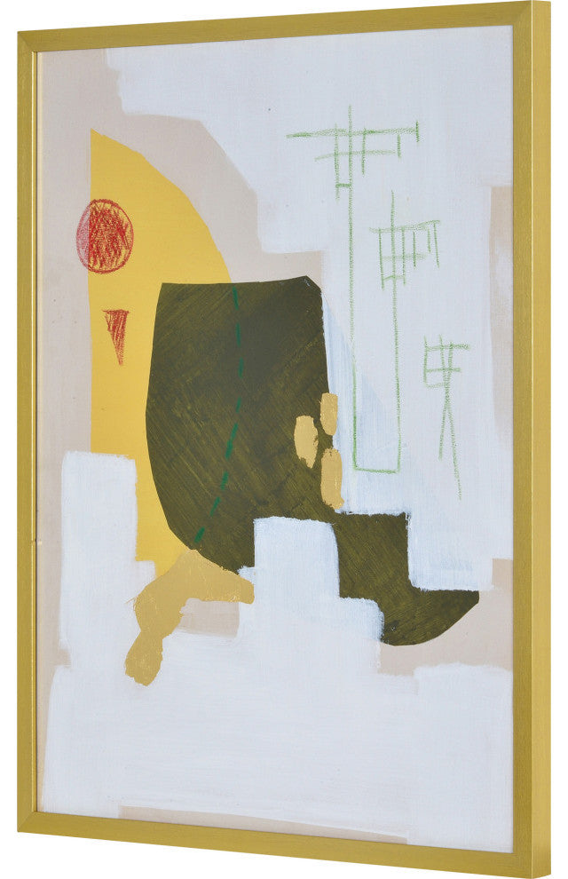 A playful innocence permeates the mid-century modern interior when these two cotton canvases make their appearance. While each piece of art shares an eye-catching and on-trend myriad of colours, collage paper, and gold leaf detailing, their configurations feel entirely unique. Hanging vertically or horizontally within the living room or bedroom space, the shadow box setup heightens the creative impression.