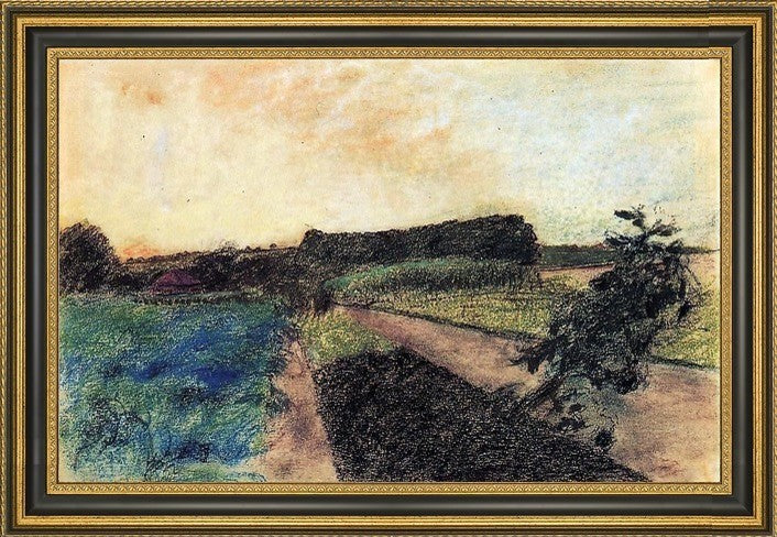 18" x 27" Edgar Degas Landscape on the Orne framed premium canvas print reproduced to meet museum quality standards. Our Museum quality canvas prints are produced using high-precision print technology for a more accurate reproduction printed on high quality canvas with fade-resistant, archival inks. Our progressive business model allows us to offer works of art to you at the best wholesale pricing, significantly less than art gallery prices, affordable to all. This artwork is hand stretched onto wooden stretcher bars, then mounted into our 3 3/4" wide gold finish frame with black panel by one of our expert framers. Our framed canvas print comes with hardware, ready to hang on your wall. We present a comprehensive collection of exceptional canvas art reproductions by Edgar Degas.
