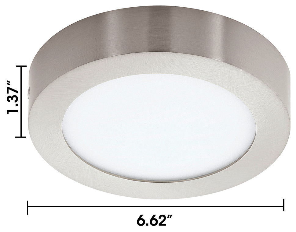 The Fueva 1 by Eglo has a clean modern design. The smooth finish is a durable matte nickel finish with a white diffuser. The light weight of the material makes for easy installation, although with the integrated LED, there is no need to replace the bulb. Additional Product Information: Collection: Fueva 1 Item Finish: Matte Nickel Style: Contemporary Glass/Shade Color: White Diameter (inches): 6 5/8" Height (inches): 1 1/2" Number of Bulbs: 1 Bulb Base Type: LED Bulb Type: LED Max Wattage (Watts): 11W Suitable For Locations?: Damp Light Direction: Down Material: Cast Metal, Glass Country: China