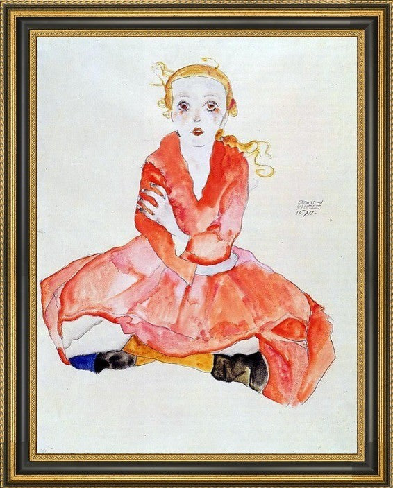 18" x 24" Egon Schiele Seated Girl Facing Front framed premium canvas print reproduced to meet museum quality standards. Our Museum quality canvas prints are produced using high-precision print technology for a more accurate reproduction printed on high quality canvas with fade-resistant, archival inks. Our progressive business model allows us to offer works of art to you at the best wholesale pricing, significantly less than art gallery prices, affordable to all. This artwork is hand stretched onto wooden stretcher bars, then mounted into our 3 3/4" wide gold finish frame with black panel by one of our expert framers. Our framed canvas print comes with hardware, ready to hang on your wall. We present a comprehensive collection of exceptional canvas art reproductions by Egon Schiele.