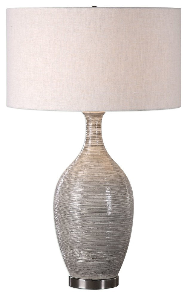 - Color/Finish: This Ceramic Base Features A Coarse, Horizontal Texture, Finished In A Mushroom Gray Glaze, Accented With Plated Polished Nickel Details.