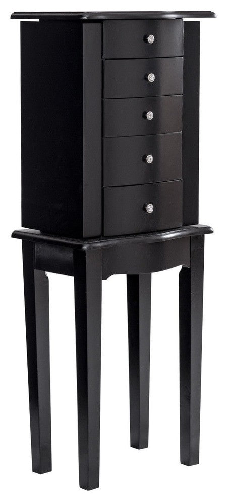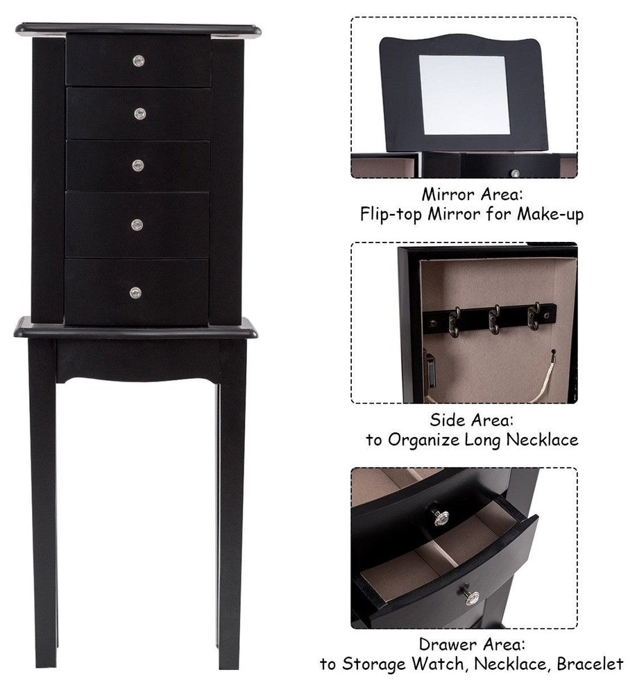 The standing jewelry cabinet is an attractive artwork that can organize various jewelry. It is specially designed for all your valuables, helps your jewelry in an organized manner, prevents them from getting tangled, and keeps your jewelry safe. It"™s elegantly designed with modern, smooth lines for an attractive and functional piece, which fits with your bedroom decor. In addition, the 4 strong and stable legs make this jewelry armoire timeless and elegant. - Brand new and high quality- Elegantly designed with modern, smooth lines- Lift-top lid with mirror opens to reveal a lined and divided compartment- Powerful storage capacity- 5 drawers, 2 swing-out doors, 6 necklace hooks with holdback- 4 strong and stable legs- Perfect for your all kinds of pieces of jewelryMaterial: MDF + wood + glassColor: As pictures showNet weight: 15.4 lbsOverall dimensions: 13" x 9" x 33" (L x W x H)Cabinet size: 7" x 15" x 2" (L x W x H)Drawer size: 6" x 6" x 3" (L x W x H)Mirror size: 7" x 6" (L x W)