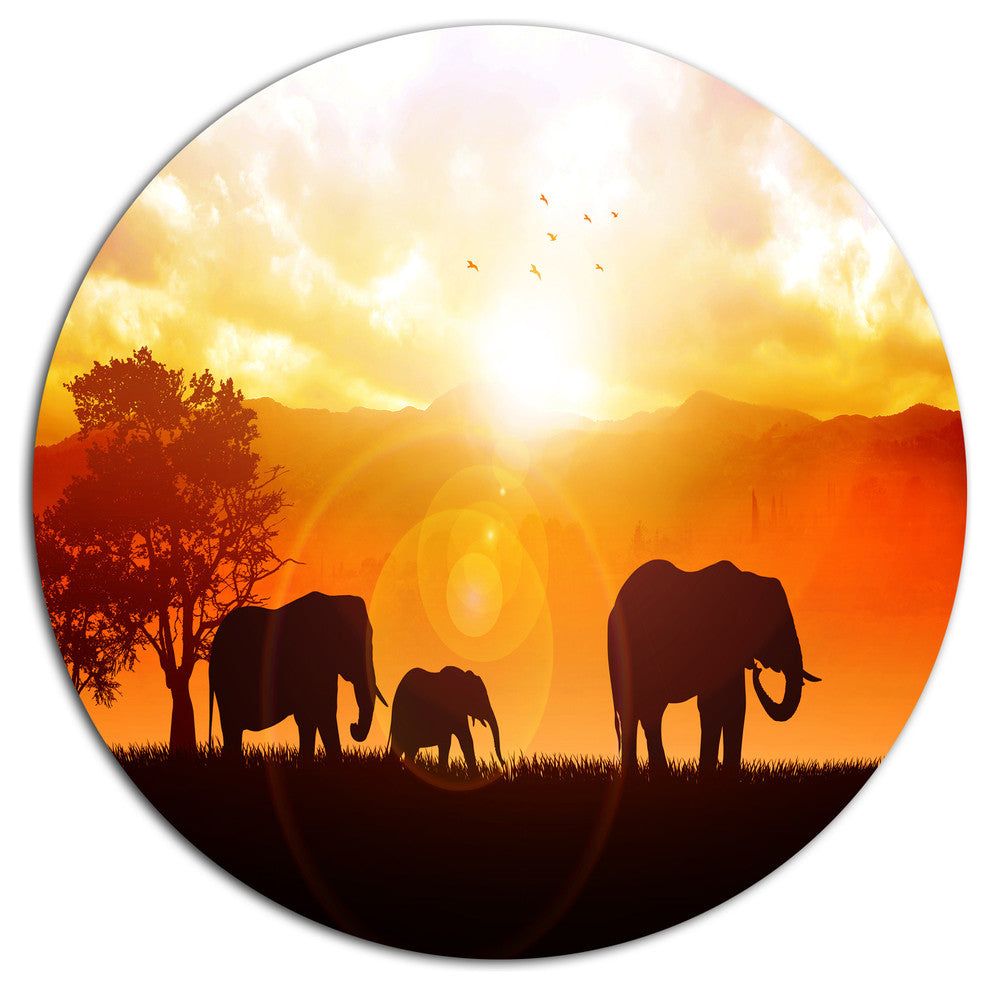 Bring Contemporary Abstraction to your home with this large Circle Metal wall art. This Elephants Walking At Sunset Metal Artwork makes it the focal point of any room or office.