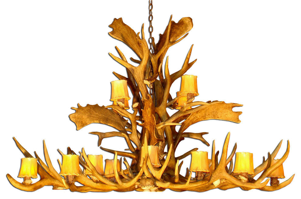 Real Antler Elk Fallow Chandelier (65-68"D x 35-36"H), 16 Light Sockets, 6 feet of rustic bronze chain. With Rawhide Shades.Handmade in North America using top quality naturally shed real antlers. Sockets are made to resemble real antler, each socket rated up to 60 Watts. Comes balanced and ready to hang. Frosted Bent Tip Candelabra Bulbs included. Certified in U.S & Canada (CSA listed to comply with UL 1598)