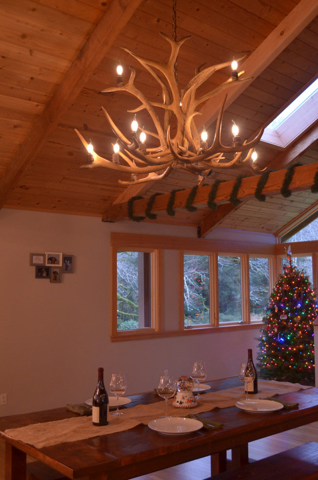 Real Antler Inverted Elk Chandelier (58-62"D x 37-39"H), 15 Light Sockets, 6 feet of rustic bronze chain. Handmade in North America using top quality naturally shed real antlers. Sockets are made to resemble real antler, each socket rated up to 60 Watts. Comes balanced and ready to hang. Frosted Bent Tip Candelabra Bulbs included. Certified in U.S & Canada (CSA listed to comply with UL 1598)
