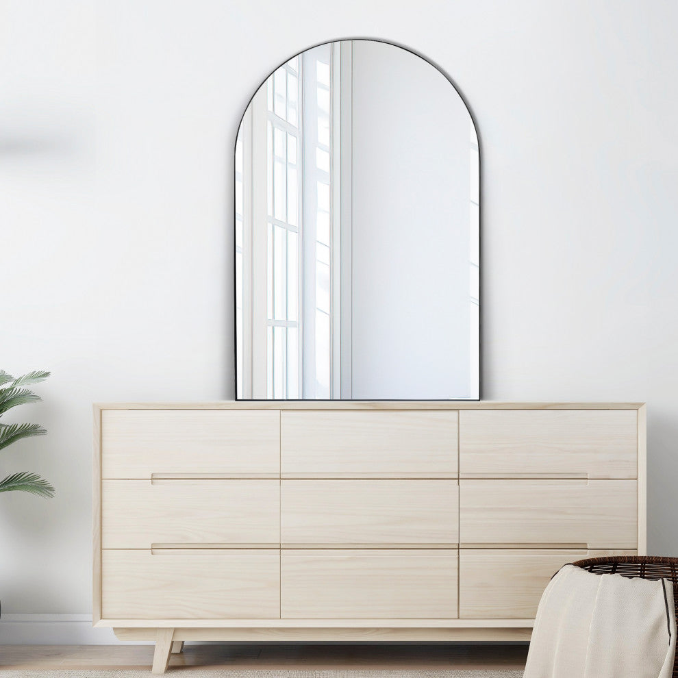 This sleek, modern mirror has a classic arched top that will add a vintage vibe to any space. The versatile wall-hung or leaning design is strengthened by a narrow metal frame. Its vertical orientation is ideal for a bathroom vanity, bedroom or entry area.Features:• Mirrored glass has a minimalist black metal frame• Contemporary 24" wide design visually expands your space• Add vintage style to a bedroom or living room with this versatile mirror''s timeless shape• Hanging device: MDF backboard•  with • Mirror Orientation: Vertical• Body Material: Metal• 36 inches high x 24 inches wide x 1.5 inches deepAbout us:You see an ordinary mirror.We see an enhancement to help with making your fashionable statement.A perfectly smooth-edged frame with LED lighting and uniform surface casts a flaring reflection of the subject and surroundings. Our vast mirror catalog includes a variety of designs, shapes and sizes.JONATHAN Y Lighting - a fashion revolution in home decor.
