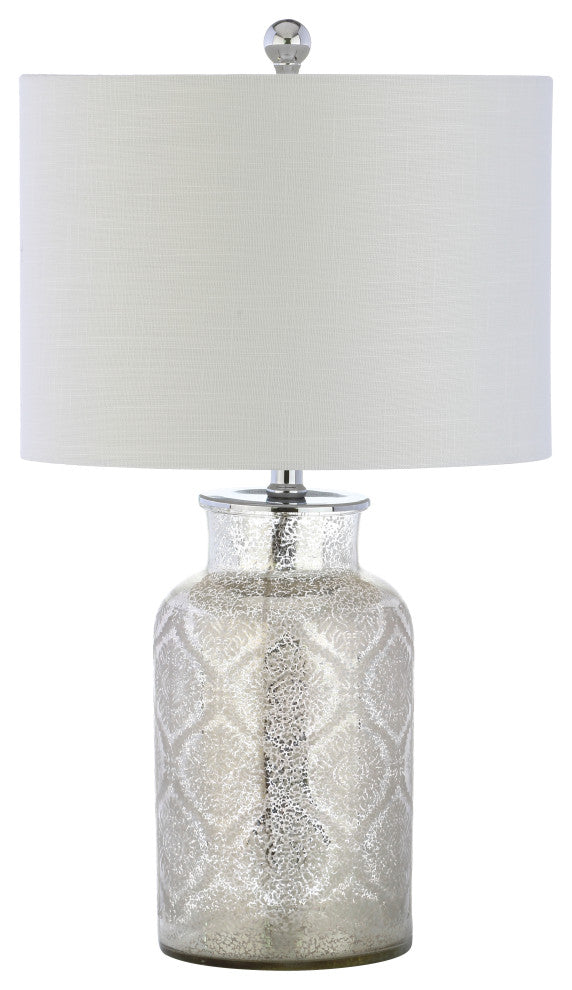 Mercury glass has been around since the 18th century, but gets a modern update in this style where the silver is applied in a decorative pattern instead of all-over finish. True to its "art glass" roots, this lamp was designed with beauty in mind but is also inherently functional with chrome components and LED compatibility. A silk-wrapped cord and matching finial finish this fashionable find.-Silver applied in a globally inspired trellis design-100% cotton hardback drum shade in white-Beautiful to display or easy to conceal: the 60" cord is silk-wrapped-On-off rotary switch on socket-Takes one bulb and compatible with any type "A" 100 watt incandescent, 23 watt CFL, or 12 watt LED -Eco-friendly 9W LED bulb included-Sleep easy knowing that all components of this piece are UL Listed, safe for your home''s electrical grid -Color: Mercury Silver with white shade-Body Material: Glass-Base Material: --Finial Material: Metal-Finial Color: Chrome-Harp Color: Silver-Includes: One (1) lamp(s)-Minor Assembly Required-Lamp: 24.5 inches high x 14 inches wide x 14 inches deep-Shade: 10 inches high x 14 inches wide x 14 inches deepAbout us: You see a lamp.We see a decorative work of art.A perfectly curved shade casts a dramatic shadow on a floor. A silk cord you never want to hide. LED lightbulbs: as easy on the environment as they are on the eyes. The JONATHAN Y Lighting collection considers every detail from impeccably sourced materials to designer styling. And our prices are so attractive, we''ve transformed a functional necessity into a fashion accessory.JONATHAN Y Lighting - a fashion revolution in home decor.