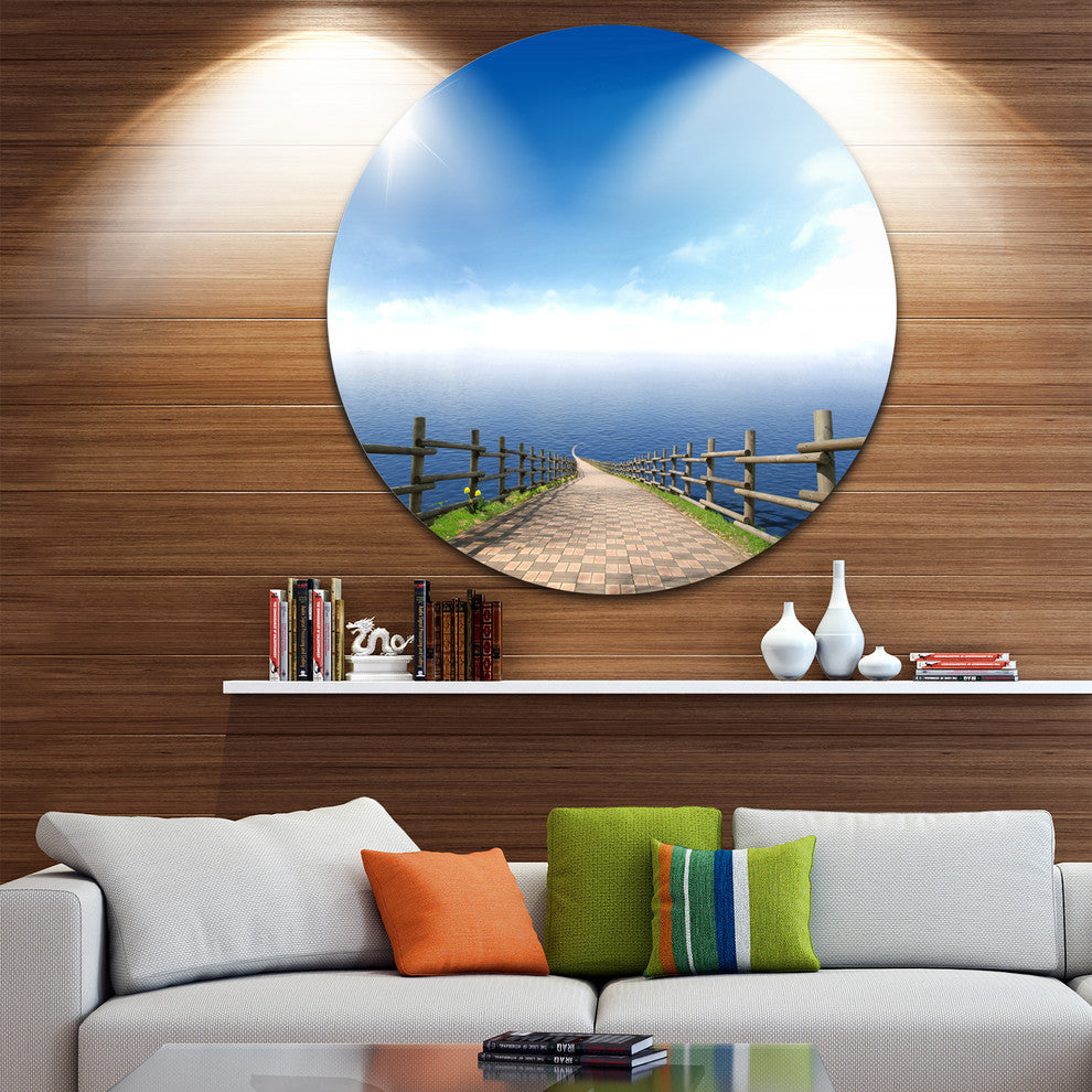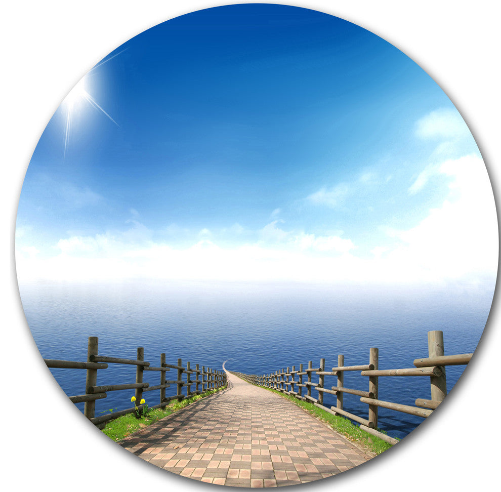 Bring Contemporary Abstraction to your home with this large Circle Metal wall art. This Endless Pier into Blue Sea Metal Artwork makes it the focal point of any room or office.