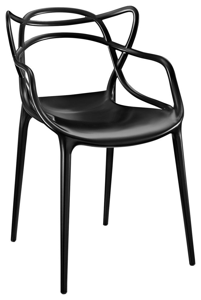 Twists and turns greet you at every turn with the Entangled dining chair. Designed to portray verdant growth amidst organic conditions, there is no staged pretension here. Unabashedly, Entangled is a molded plastic dining chair that conveys the complexity of drive and ambition, love and life. Outfitted with foot caps to prevent your floor from scratching, the Entangled dining chair comes fully assembled with an easy wipe clean surface. Set Includes: One - Entangled Dining ArmchairModern dining chairPP plastic constructionNo assembly requiredNon-marking foot capsEasy wipe clean surfaceWeight Capcity 330 lbs.No Assembly RequiredOverall Product Dimensions: 21"L x 23"W x 33"HSeat Dimensions: 18"L x 19"W x 18"HArmrest Dimensions: 12"L x 26"HBackrest Height: 15"HProduct Weight: 9 LBsProduct Color: BlackProduct Material: PP Plastic Foot Guide