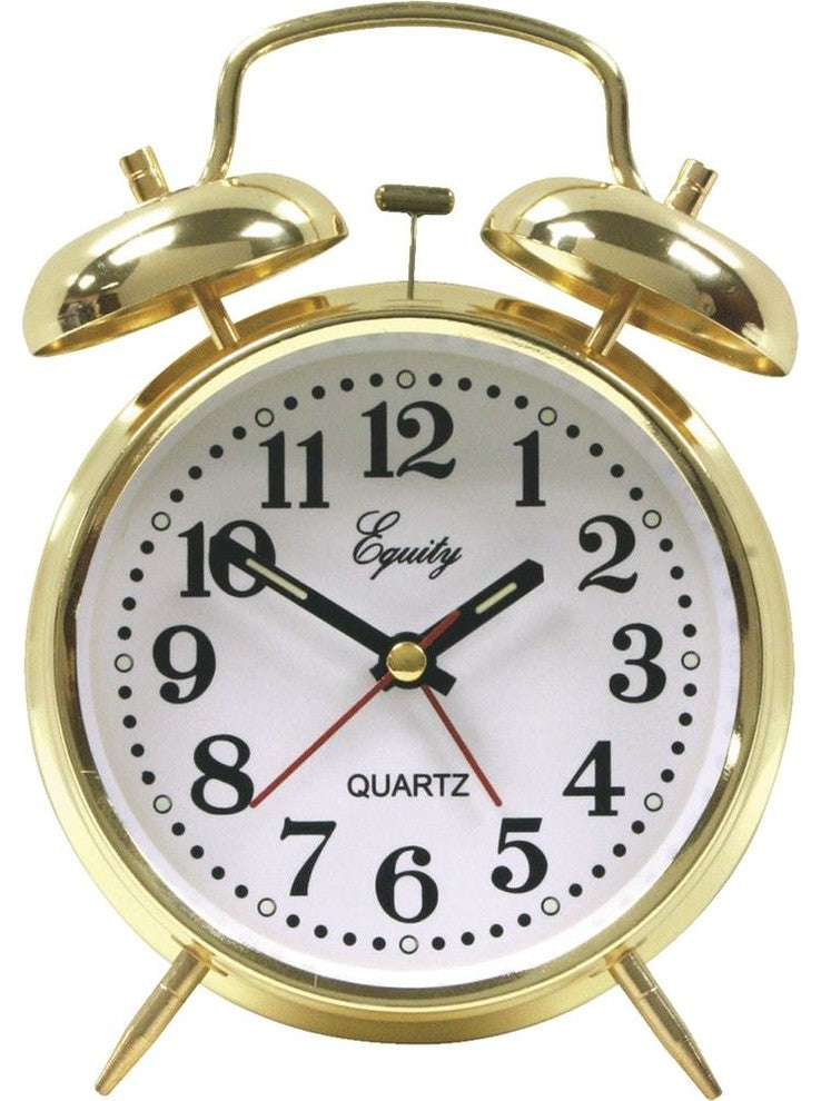 Love great retro looks, but have a hard time remembering to wind up the clock every day? The Equity® loud twin bell analog alarm clock in gold metal case is the perfect combination of old-fashioned good looks with some modern practicality. Luminous hands and hour dots for night glow. A handsome keywound alarm clock, requires no electricity or batteries for operation. This alarm clock offers a traditional look, along with accurate, reliable quartz movement and a super loud wake up sound that''s sure to wake even deep sleepers.• Loud twin bell alarm• Gold metal case• Glass lens• 36 hour movement• Luminous hands and hour dots• Key wound, no batteries needed.Dimensions:• Length: 6.5"• Width: 4.5"• Depth: 2"