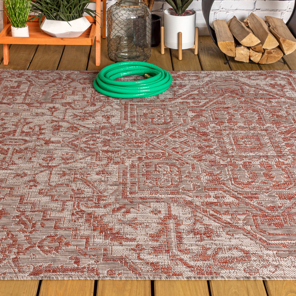 With its star-inspired medallion, this borderless rug adds dreamy Bohemian style to an outdoor porch or patio. Varied tones of red and rust on a mingled gray background give this rug a hand-woven, vintage vibe. The flatweave design is great for high-traffic spaces indoors too.Features:• Flat-weave construction of 100% polypropylene• Red and taupe with a handwoven mingled texture• Water resistance with 0.19" pile• 100% Polypropylene• No backing, use of rug pad is recommended (sold separately)• Power Loomed in Turkiye• Actual Dimension: 6 ft. x 9 ft.• Color: Red/Taupe• Thickness measures: 0.19 in.• Available in multiple sizes and/or colorsRug Care:• Vacuum regularly and spot clean as needed; avoid direct and continuous exposure to sunlight; use brushless vacuum; remove spills immediately; if liquid, blot with clean, undyed cloth by pressing firmly around the spill to absorb as much as possible; for hard to remove stains, professional rug cleaning is recommended; store in a dry, well ventilated area and rotate for consistent wear• Packing and shipping may cause temporary creases in rugs, which will flatten out after a week on the floor; to expedite the process, try back-rolling your rug before laying it down, and then allow ample time for the remaining creases to relax• Please Note: Due to differences in monitors, some rug colors may vary slightly. Lengths and widths may vary from the published dimensions. Patterns may vary slightly according to shape and size selected.About us:Style your floors with JONATHAN Y. By combining fine craftsmanship and design, this New York creative studio is bringing fashion to your floors. The collection mixes sustainable organic materials, vibrant colors and trend worthy styles to create JONATHAN Y''s distinctive catalog of rugs.