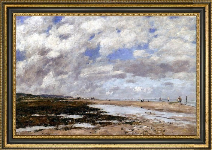 16" x 24" Eugene-Louis Boudin The Beach Deauville framed premium canvas print reproduced to meet museum quality standards. Our Museum quality canvas prints are produced using high-precision print technology for a more accurate reproduction printed on high quality canvas with fade-resistant, archival inks. Our progressive business model allows us to offer works of art to you at the best wholesale pricing, significantly less than art gallery prices, affordable to all. This artwork is hand stretched onto wooden stretcher bars, then mounted into our 3 3/4" wide gold finish frame with black panel by one of our expert framers. Our framed canvas print comes with hardware, ready to hang on your wall. We present a comprehensive collection of exceptional canvas art reproductions by Eugene-Louis Boudin.