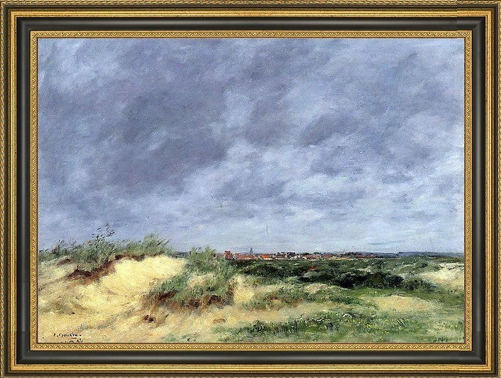 16" x 24" Eugene-Louis Boudin The Berck Dunes framed premium canvas print reproduced to meet museum quality standards. Our Museum quality canvas prints are produced using high-precision print technology for a more accurate reproduction printed on high quality canvas with fade-resistant, archival inks. Our progressive business model allows us to offer works of art to you at the best wholesale pricing, significantly less than art gallery prices, affordable to all. This artwork is hand stretched onto wooden stretcher bars, then mounted into our 3 3/4" wide gold finish frame with black panel by one of our expert framers. Our framed canvas print comes with hardware, ready to hang on your wall. We present a comprehensive collection of exceptional canvas art reproductions by Eugene-Louis Boudin.
