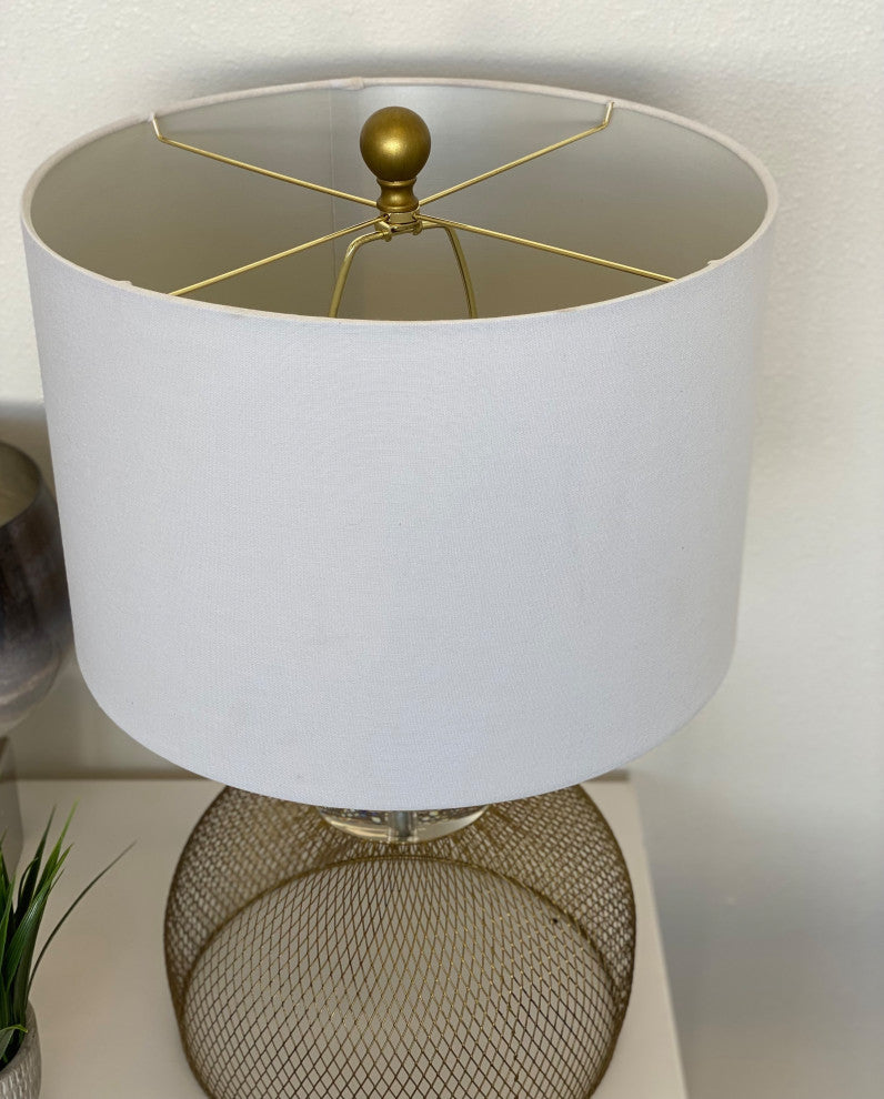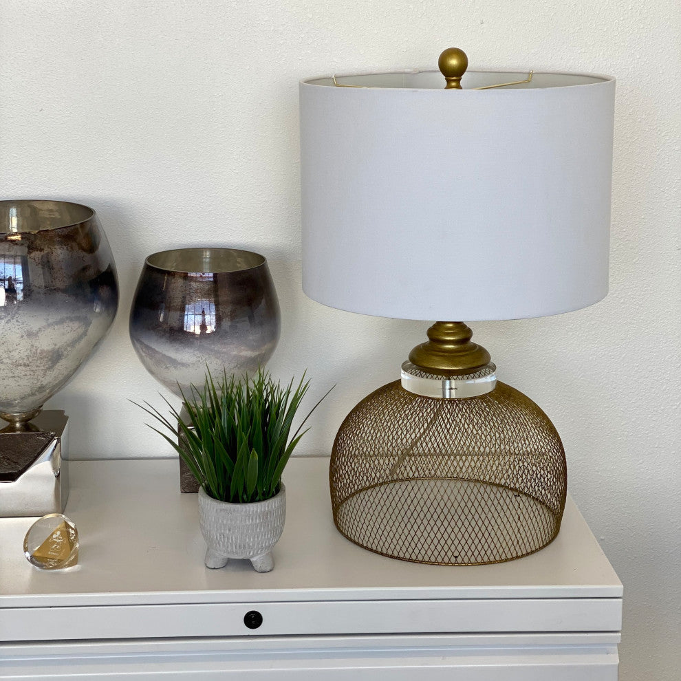 Accent your home decor with this trendy table lamp. The Eugenia Metal Cage Table Lamp features a golden open-cage base and beige lamp shade that adds warmth to any space.Metal cage table lampDrum shadeRequires 1 (Type-A) 13-watt bulb, includedColor: GoldMaterials: Metal and acrylicDimensions: W 16" x D 16" x H 26"