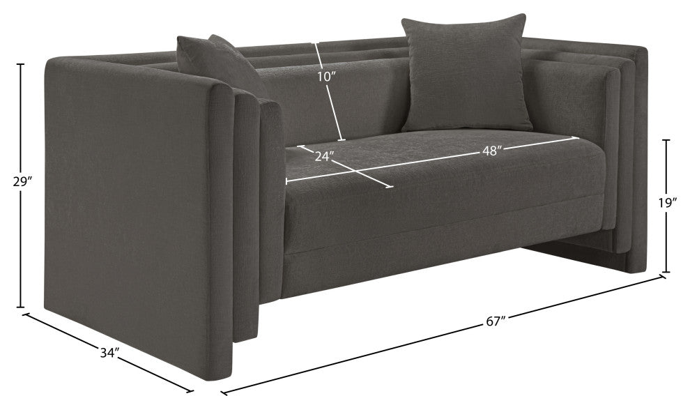 Make this Everett grey chenille fabric loveseat the center of a cozy reading nook. Handsome from every angle, this posh loveseat is plumply appointed to put supreme comfort within easy reach. Soft grey chenille upholstery fabric adds to its lavish feel while a staggered design gives it a modern edge. An included pillow gives it a beckoning vibe while the loveseat''s solid wood inner frame makes it a lasting addition in any room.Overall Product Dimensions: 67" W x 34" D x 29" HSoft Grey Chenille FabricSolid Wood Inner FramePillows IncludedContemporary DesignSeat Dimensions: 48" W x 24" D x 19" HArm Height: 30"Back Height: 30"