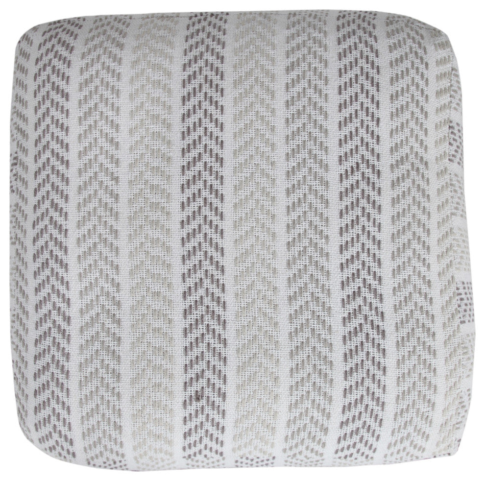 Providing form, function, and fashion all in one charming package, this pouf features an eye-catching chevron design to go with any style from contemporary to transitional to farmhouse. The interwoven stripes of natural white and dark to light gray makes this the perfect neutral necessity for any space. Easily tucked away or toted to another room in your home, use this all-in-one object as an additional seat, footrest, stool, ottoman, side table, or just stylish decor. The possibilities are endless! STRUCTURED STYLE: Designed with mobility in mind, this lightweight pouf is sturdy enough to sit on and easily moved from room to room. Dense EPS filling is supportive and helps hold its shape to keep your space full of stylish function! MAKER TO MARKET: Woven with traditional textile techniques, this pouf is an intricately crafted home accent made by skilled artisans in India. Crafted with care, each piece is unique with its own individuality. FUNCTIONAL, FASHIONABLE FURNITURE: Poufs are a popular addition to any bedroom, living room, home office, dorm, and small space with their versatile use. Meet all your seating and style needs with one accent! PACKAGE INCLUDES: (1) 18" x 18" x 14" Fully Assembled 100% Cotton (EPS Balls Filling) Small Cube Foot Stool Pouf Ottoman PLEASE NOTE: The digital images may vary due to differences in computer monitors, some colors may vary slightly. CLEANING AND CARE: Spot Clean with Mild Detergent and Water. Compressed packaging may cause tassels, fringe, and shag to lay flay. Easily fluff it with your fingers to bring out the texture.