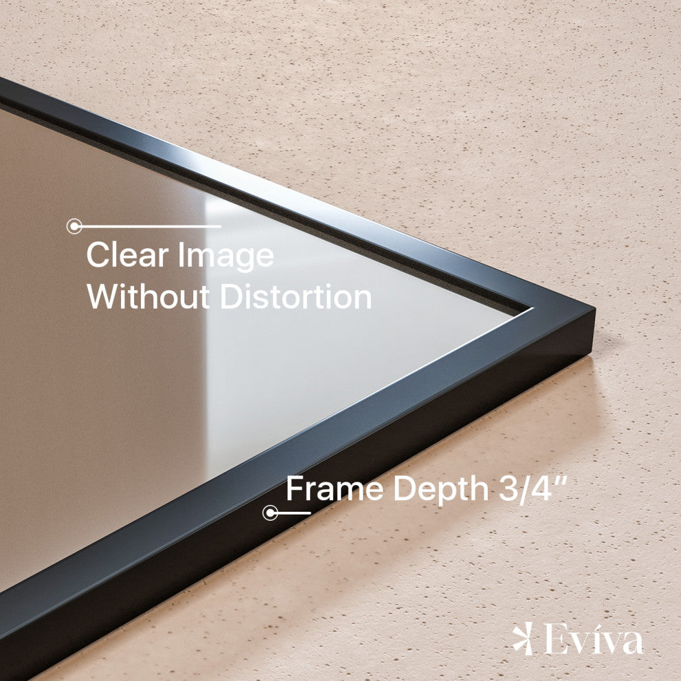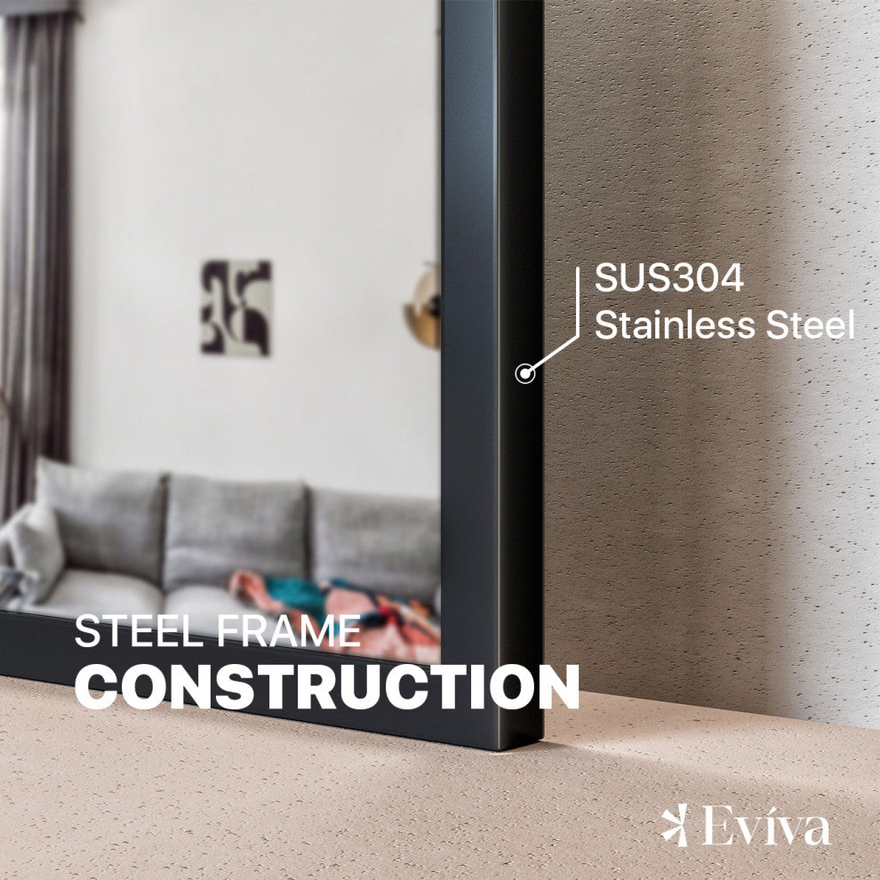 The Eviva Black Mirror adds a touch of modern elegance to your home or bathroom. Its sturdy aluminum frame with a sleek black finish, with rust free premium material ensures durability and style. The mirror features burst proof glass with straight edges and crystal clear reflection and minimal distortion, with 9mm waterproof back and allows for both horizontal and vertical mounting options. The Black Mirror is available in various widths from 24" to 72" and a height of 30", and includes all necessary mounting hardware and brackets for easy installation.Sturdy rectangular aluminum frame with rust-free coatingFeatures a stylish black finish and 0.75" frame thicknessPremium quality mirror glass with straight edges and 9mm waterproof backCrystal clear reflection with minimal distortionOffers both horizontal and vertical mounting optionsIncludes all necessary mounting brackets and hardware for easy installation