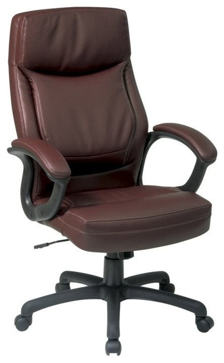 Executive High Back Burgundy Red Bonded Leather Office ChairExecutive seating chairs provide great comfort for a reasonable price. It features thick padded seats, one touch pneumatic seat height adjustments and padded arms. Bonded Leather completes the design. Locking Tilt Control with Adjustable Tilt Tension. Padded Nylon Loop Arms. Dual Wheel Carpet CastersFeatures: • High Back • Back Dimensions: 18.75 in. W x 30 in. H x 4.75 in. Thick • Thick Padded Contour Seat and Back with Built-in Lumbar Support • One Touch Pneumatic Seat Height Adjustment • Locking Tilt Control with Adjustable Tilt Tension • Padded Nylon Loop Arms • Eco Leather: Mocha with Two Tone Stitching • Heavy Duty Nylon Base • Dual Wheel Carpet Casters • Arms to Seat height :8.5" - 8.5" • Arms to Floor height: 27" - 30"Specifications: • Chair Dimensions: 26.25"W x 29.5"D x 46"H • Chair Weight: 34 lbs • Seat Dimensions: 275 lbs • Product Dimensions: 48.5"H x 26.75"W x 26.25"D • Seat Dimensions: 20.75"W x 21"D x 4.5T • Seat Height: 19" - 22" • Back Dimensions: 20"W x 26.75"H x 4"T